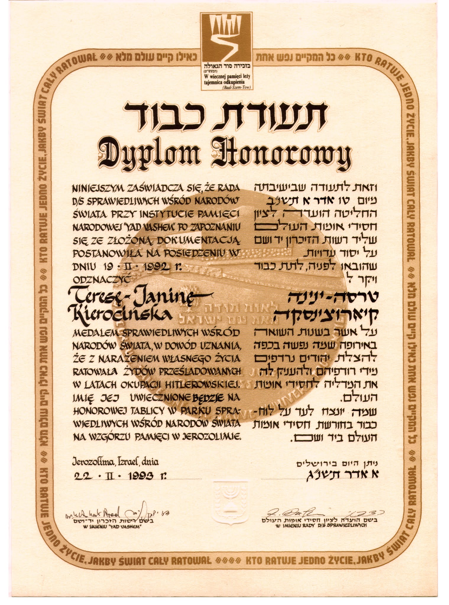 "Niniejszym zaświadcza się, że Rada d/s Sprawiedliwych Wśród Narodów Świata przy Instytucie Pamięci Narodowej "Yad Vashem", po zapoznaniu się ze złożoną dokumentacją postanowiła na posiedzeniu w dnia 19.02.1992 roku odznaczyć Teresę Janinę Kierocińską medalem Sprawiedliwych Wśród Narodów Świata, w dowód uznania, że z narażeniem własnego życia ratowała Żydów prześladowanych w latach okupacji hitlerowskiej. Imię jej uwiecznione będzie na honorowej tablicy w Parku Sprawiedliwych Wśród Narodów Świata, na Wzgórzu Pamięci w Jerozolimie."